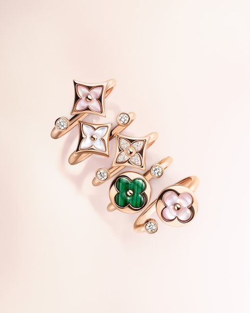 Highlighting a harmonious blend of unique stones and golds, Louis Vuitton Color Blossom plays with the delicate volumes of the iconic Monogram Flower. Boldly paired together for infinite chromatic combinations, earrings, rings, bracelets, and necklaces mingle in a convergence of color.