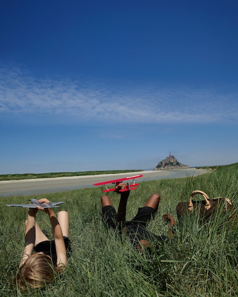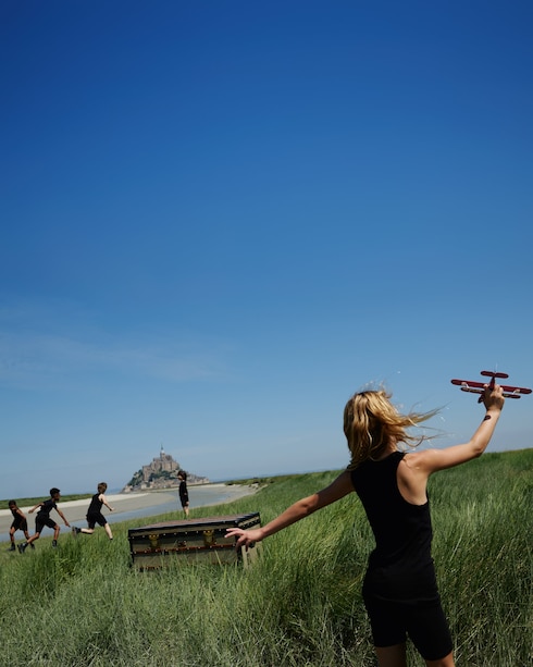 Against the monumental backdrop of France’s Mont Saint-Michel, a group of local children frolic on the tidal island’s shoreline, embodying a limitless sense of optimism and freedom.