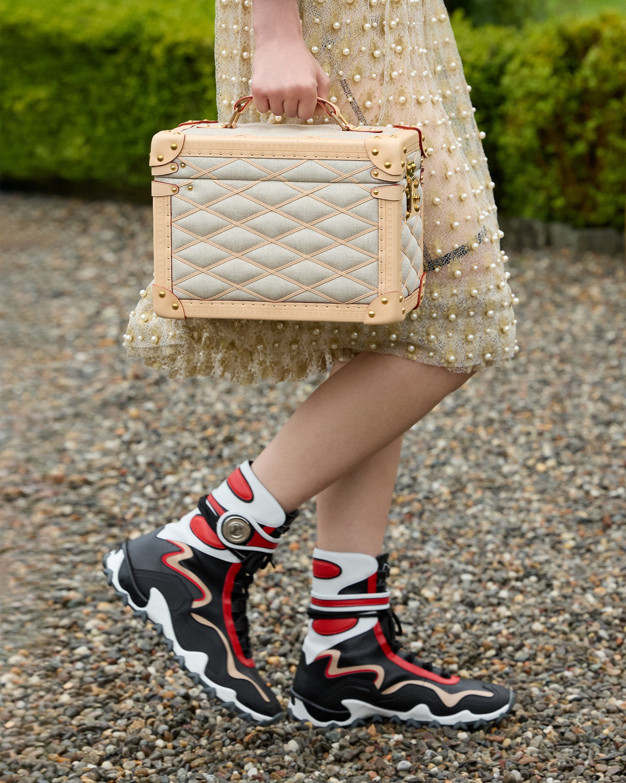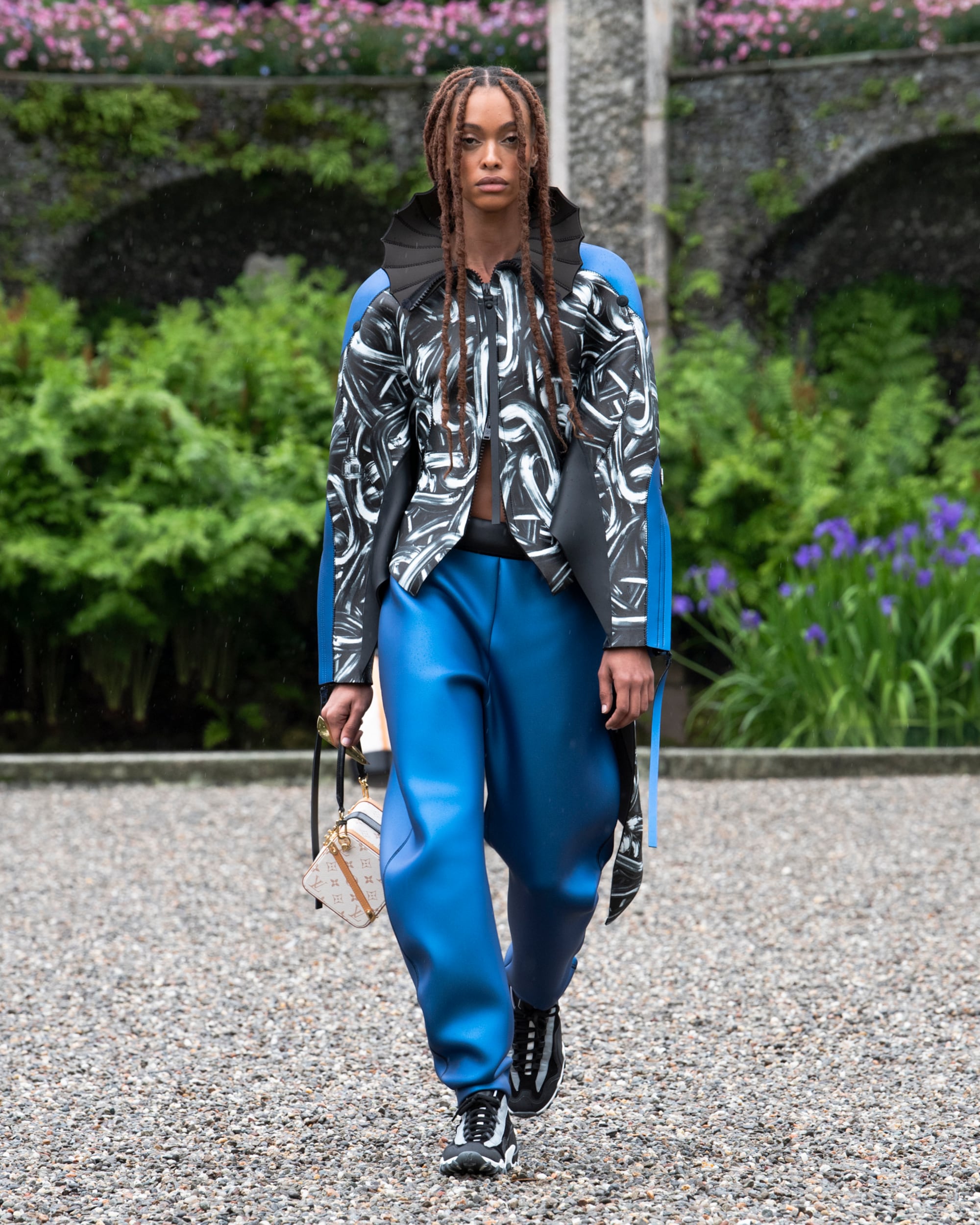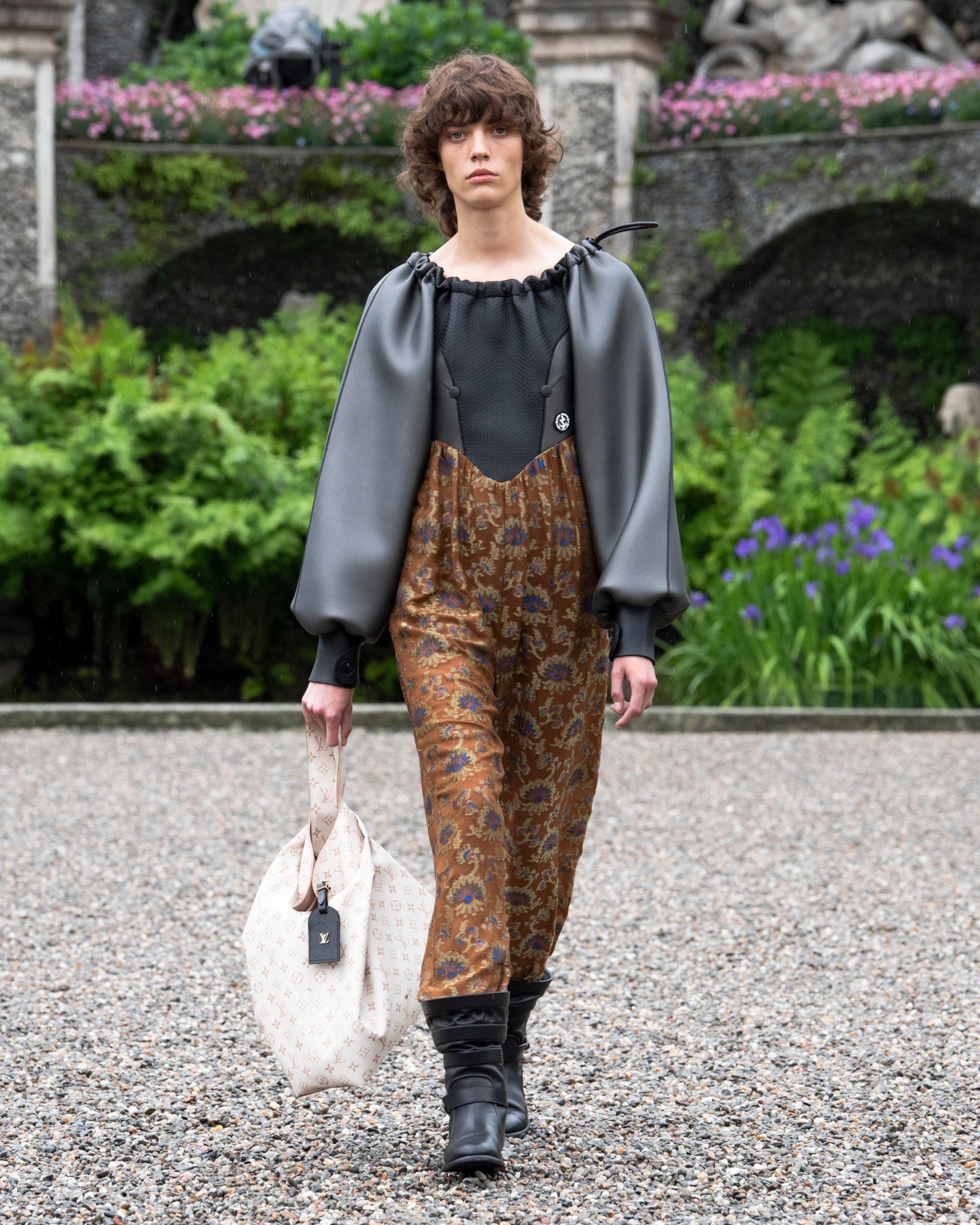 Reflecting the progression from nautical to botanical, the silhouettes are adorned with silks and sequined embroidery, emulating scales and the movement of water. On dry land, prints flourish and lines become sculptural, while bags mark a post-modern tale, enveloped in the new Monogram Dune or in colorful variations of Épi leather.