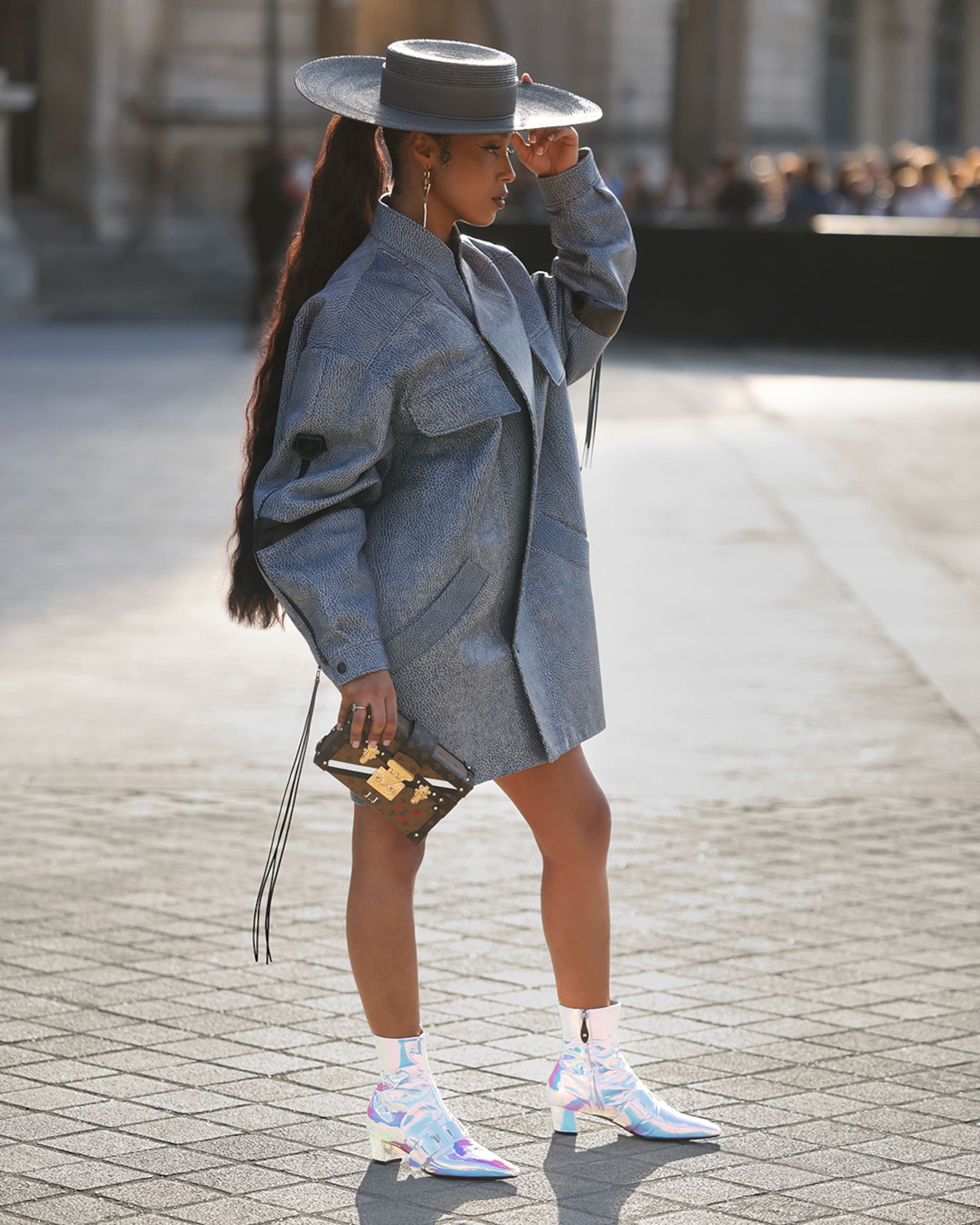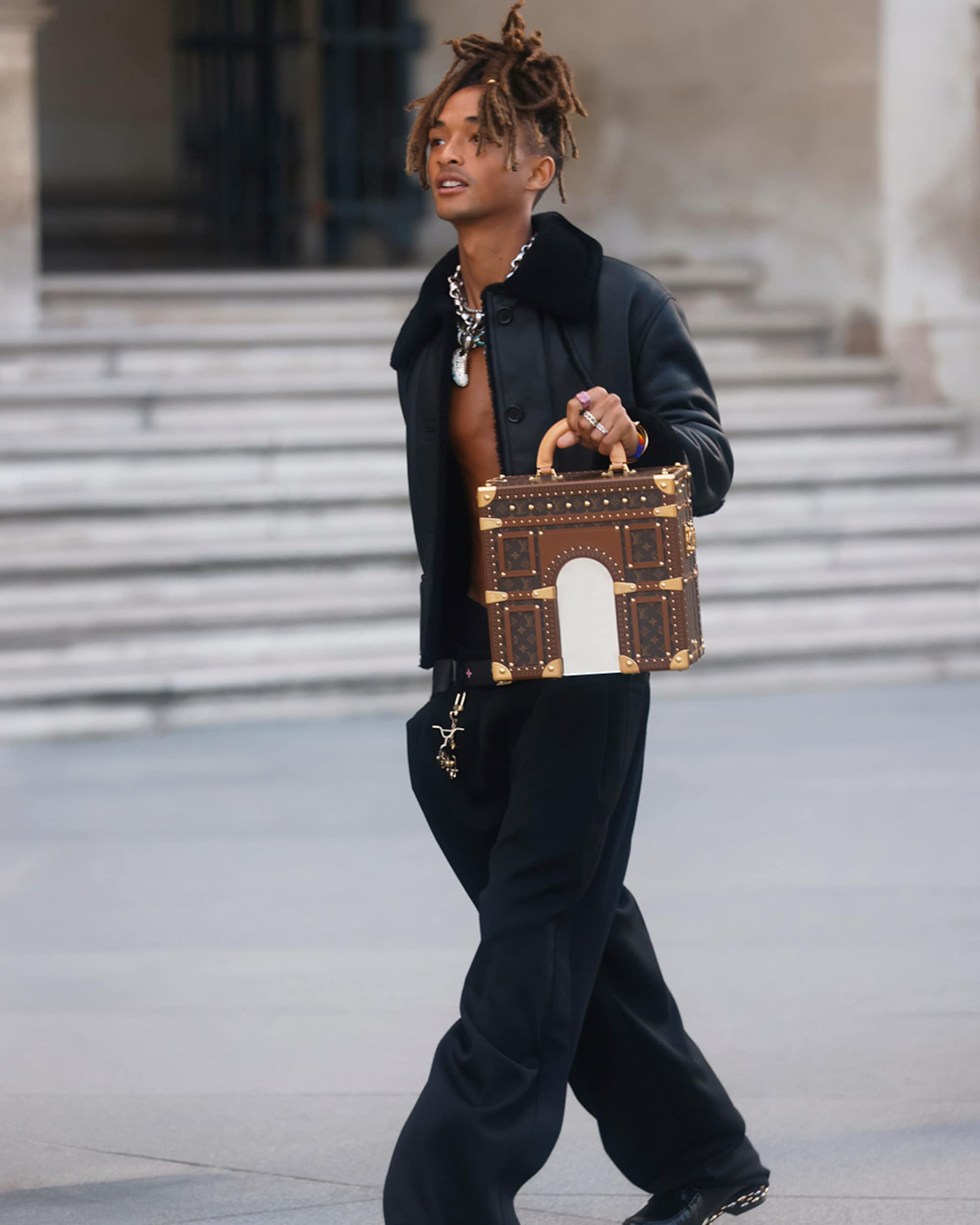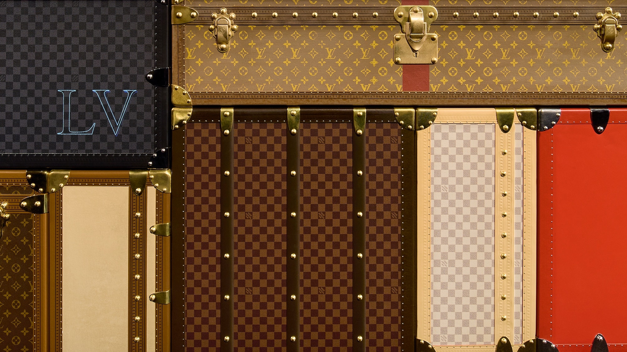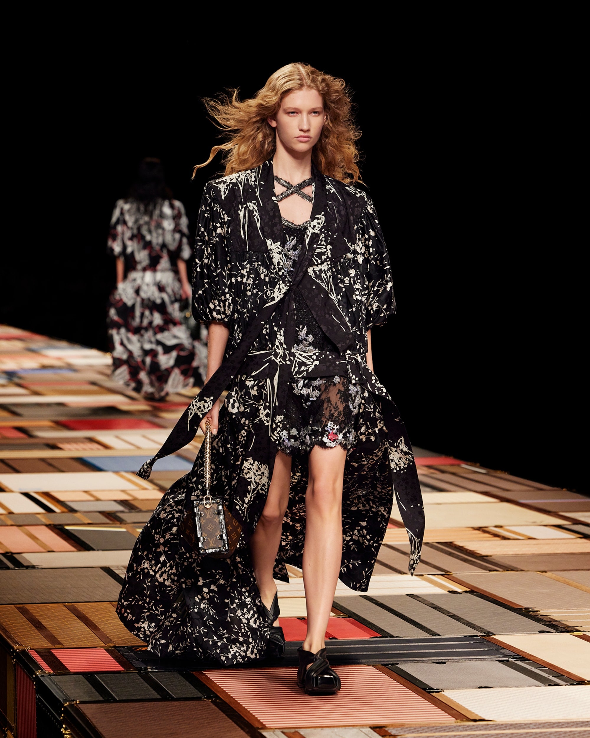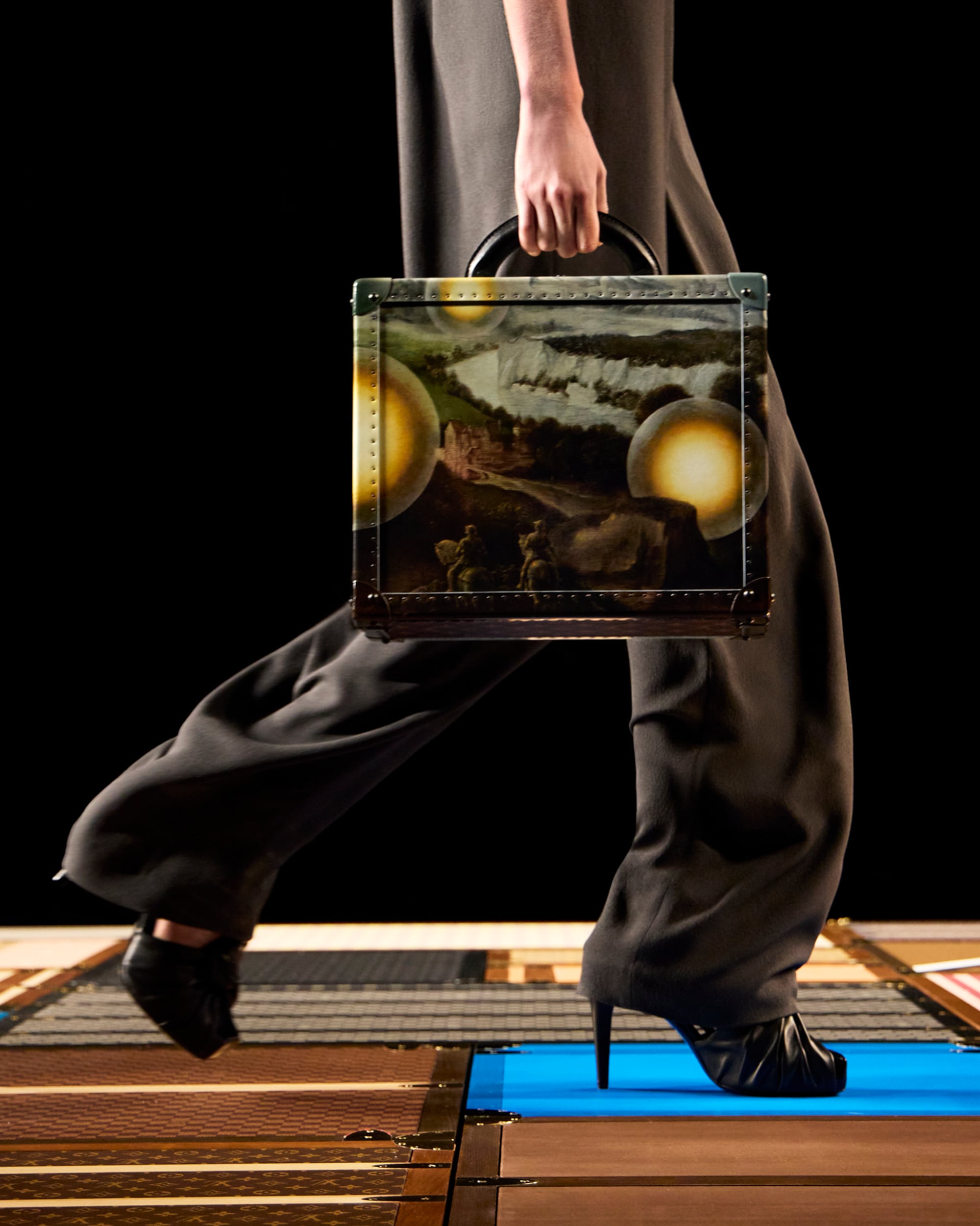 A rigid platform made up of over a thousand different trunks, the central runway of Nicolas Ghesquière's show pays homage to the history of the Maison, standing at the forefront of an immersive mirrored structure — reflecting the majestic architecture of the Cour Carrée du Louvre in Paris.