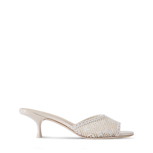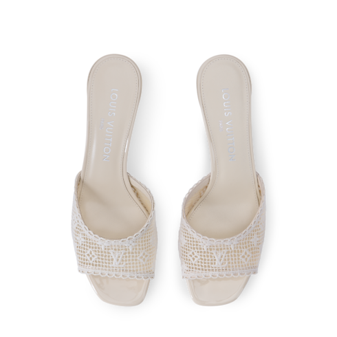 - This edition of the 6AM mule is made of fabric embroidered with the Monogram pattern, creating a delicate, lace-like effect on the wide front strap, which is further embellished with scalloped edges. This model comes on a feminine kitten heel in durable ABS, which is color-matched to the upper for a refined look.