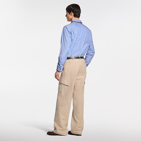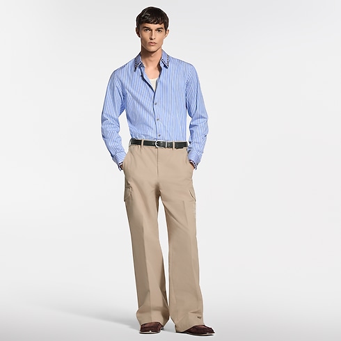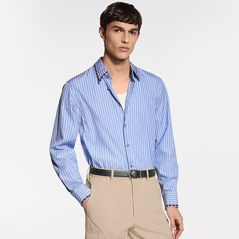 This long-sleeved shirt draws on the Spring-Summer 2026 show’s Indian Dandy inspiration. It is crafted from organic cotton with a heritage striped jacquard in fresh blue tones. Meticulously embroidered beads on the collar and the cuffs create a jewel-like effect. Perfect for layering, this piece brings a sophisticated accent to an ensemble.