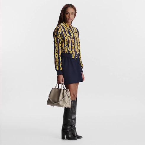 The Bella Tote bag is made from supple Mahina calf leather in a subtle and elegant Galet grey. The leather is delicately pleated, draped and adorned with a jewel-like chain. The Bella Tote bag blends the design of the classic bucket bag with the carryall tote, making this stylish piece perfect for everyday use.