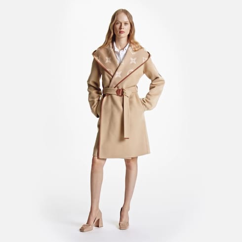 Crafted using a double face technique in a wool-silk blend, this warm, comfortable hooded wrap coat is an iconic Louis Vuitton staple. A giant Monogram motif signs the inside, while a seasonal signature belt cinches the waist to accentuate an elegant, feminine silhouette. A leather patch on the sleeve adds a final House touch.