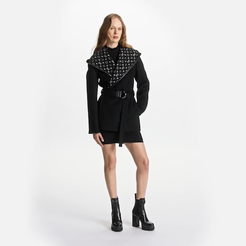 This chic short wrap pea coat is updated for the season in a fresh colourway and signed with the clothing collection’s Louis Vuitton Paris belt for a contemporary touch. The double face wool-silk blend is soft, lightweight and warm, with a voluminous hood amping up the cosiness. The piece is completed with an iconic Monogram jacquard on the inside.