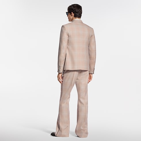 These flared pants from the Spring-Summer 2026 runway exemplify this season’s Indian Dandy aesthetic. Tailored from a fine wool glen check in elegant camel tones, they are adorned with embroidered beads resembling jewelry along the outer seam of each leg, while tone-on-tone Louis Vuitton Paris lettering discreetly signs the back. A matching jacket makes a standout suit.