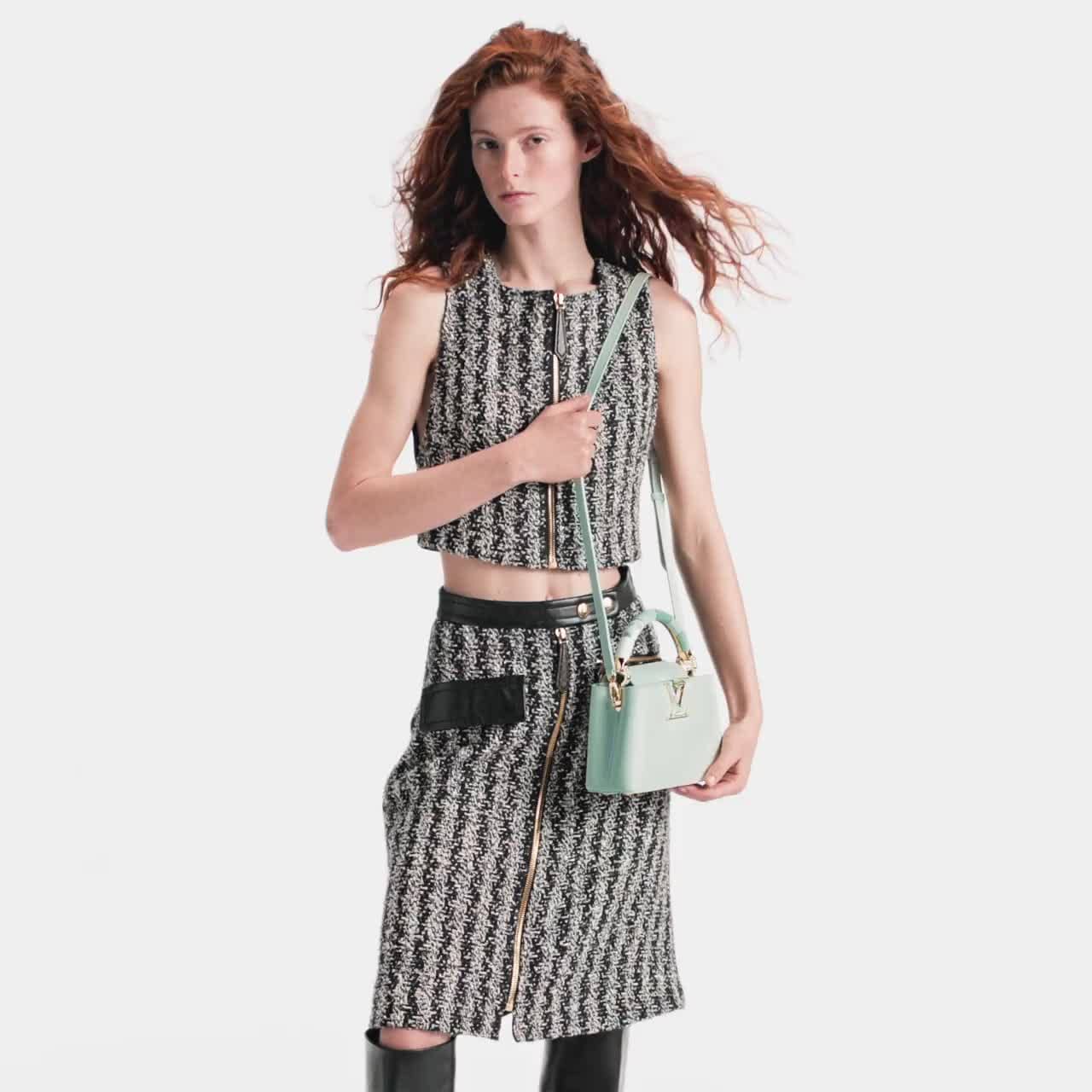 For Spring 2023, Louis Vuitton proposes a refined edition of the Capucines Mini bag in pale green Taurillon leather. The jewel-like handle, inspired by the Japanese art kintsugi, is crafted from precious karung skin, upcycled leathers and resin. A romantic flower motif adorns the bag’s iconic LV signature, a sublimely feminine touch. This is a delicate accessory for day-to-evening wear.