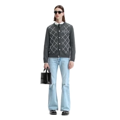 This dark gray cardigan in responsibly sourced merino wool is conceived for this collection’s festive family reunion in an aristocratic British country house. Sophisticated pearly white beads are embroidered across the front with a Damier Argyle pattern and LV lettering on the chest. Paired with a smart cotton shirt, this piece makes a chic yet relaxed evening ensemble.