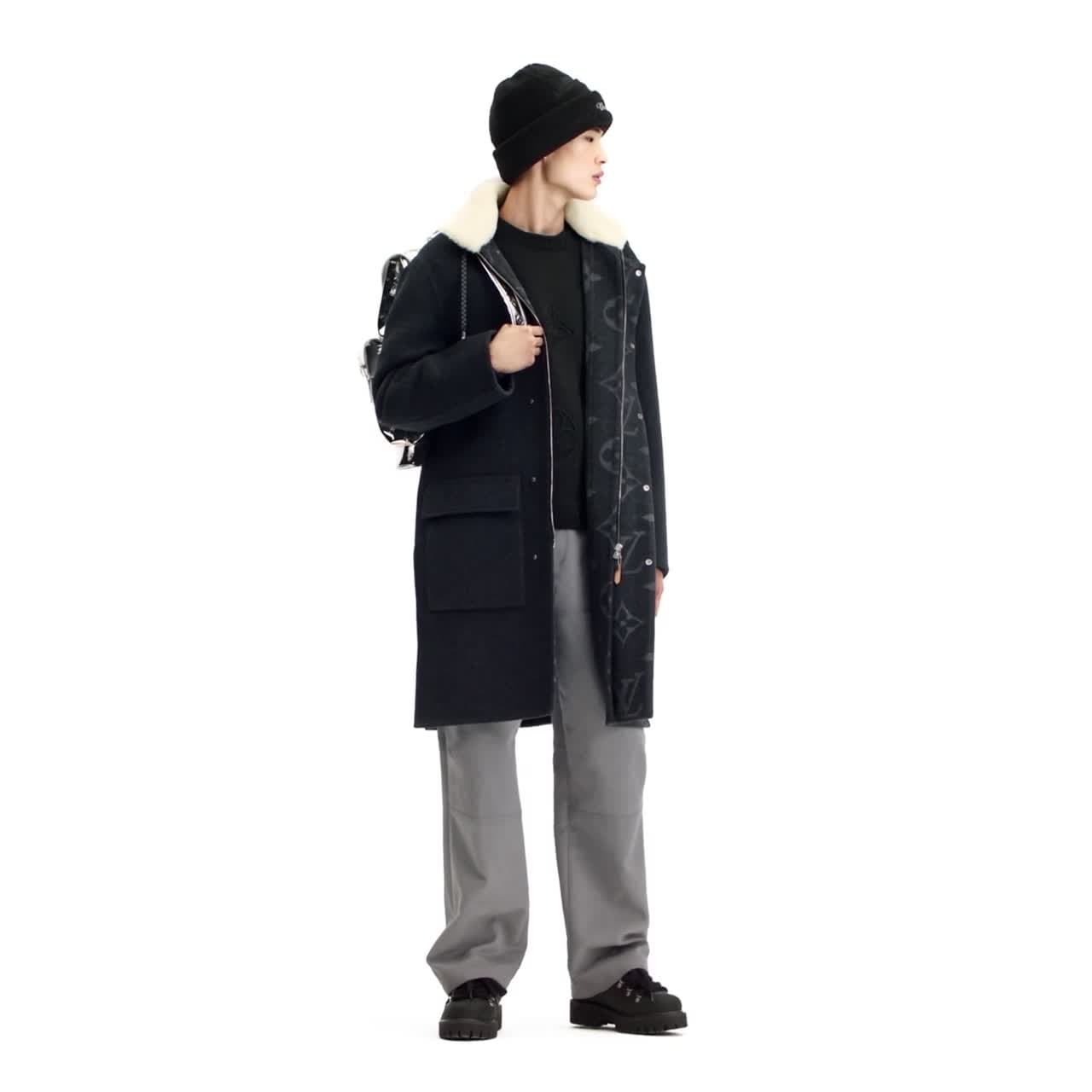 This luxurious and effortless coat is perfect for chic winter vacations. The deep gray silhouette is crafted from fluid double-face fabric in a sumptuous wool, cashmere and silk-blend, adorned with a jacquard Macro Monogram motif on the inside. An adjustable hood and a tall, shearling-lined collar provide extra warmth, while elegant accents include a woven Damier drawcord and an LV ornament at the top of the placket.