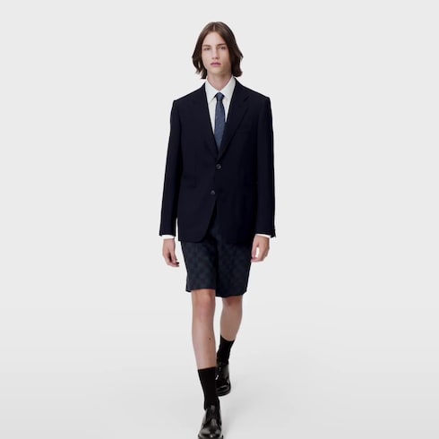 Inspired by the preppy lifestyle, this blazer in a wool blend twill brings a relaxed mood to formalwear. The timeless silhouette, in a chic navy blue, is discreetly embellished with metallic LV and Monogram Flower buttons. Paired with comfortable drawstring pants, this versatile piece makes an effortless modern suit.