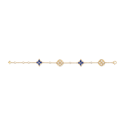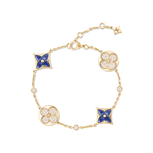 The Color Blossom pieces celebrate the emblematic Monogram Flower, designed in 1896 by Georges-Louis Vuitton, son of the founder. Set into 18-karat (750/1000) yellow gold, this precious bracelet features Star and Sun motifs carved from Sodalite, hand-polished to a high gloss and accented by brilliant round-cut diamonds. Months of work were necessary to perfect the stones’ subtle curves and sparkle. This delicate bracelet is an invitation to stack, mix or match with other models from the collection.