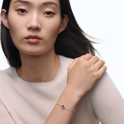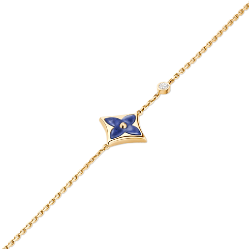 The Color Blossom pieces celebrate the emblematic Monogram Flower, designed in 1896 by Georges-Louis Vuitton, son of the founder. Set into 18-karat (750/1000) yellow gold, this precious bracelet features a Star motif carved from sodalite, hand-polished to a high gloss and accented by a brilliant round-cut diamond on the chain. Months of work were necessary to perfect the stones’ subtle curves and sparkle. This delicate bracelet is an invitation to stack, mix or match with other models from the collection.