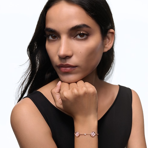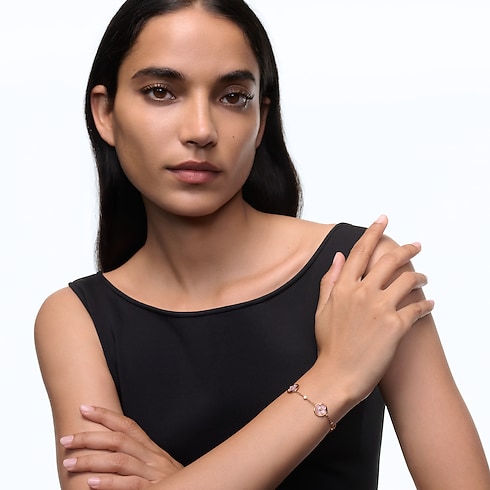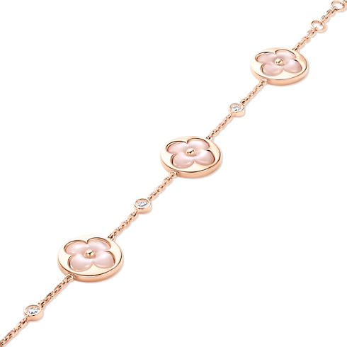 The Color Blossom pieces celebrate the emblematic Monogram Flower, designed in 1896 by Georges-Louis Vuitton, son of the founder. Crafted in 18-karat rose gold, this precious bracelet features Sun motifs carved from pink mother-of-pearl, hand-polished to a high gloss and accented by round brilliant-cut diamonds on the chain. Months of work were necessary to perfect the stones’ subtle curves and sparkle. This delicate bracelet is an invitation to stack, mix or match with other models from the collection.