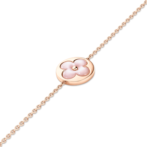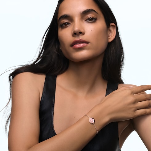 The Color Blossom pieces celebrate the emblematic Monogram Flower, designed in 1896 by Georges-Louis Vuitton, son of the founder. Crafted in 18-karat rose gold, this precious bracelet features a Sun motif carved from pink mother-of-pearl, hand-polished to a high gloss. Months of work were necessary to perfect the stone’s subtle curves and sparkle. This delicate bracelet is an invitation to stack, mix or match with other models from the collection.