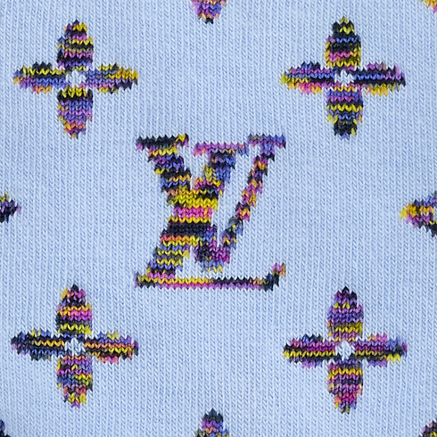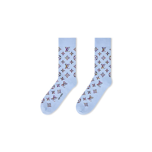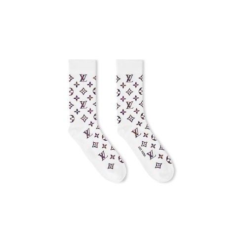 With a playfult twist on the Monogram, these colorful socks stand out throught their vibrant palette and lightweight cotton-blend feel. The House Monogram is rendered in a combination of dynamic hues, from yellow and purple, and repeated from calf to toe. These socks are signed with a Louis Vuitton logo under each foot.