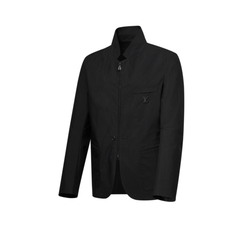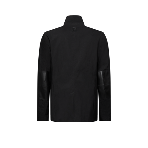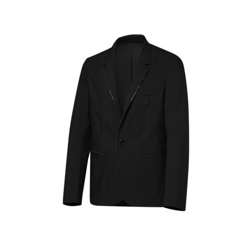 This black single-breasted jacket has an elegant silhouette twisted with utilitarian details. Crafted from technical cotton ripstop and unlined for summer ease, it has a zipper-edged lapel and black leather elbow patches. The breast pocket is adorned with an LV ornament, while a black leather Marque L.Vuitton Déposée patch signs the back. Pair with the matching cargo pants for an all black city look.