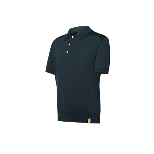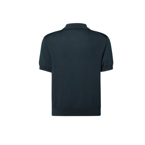 This navy blue short-sleeved polo shirt brings understated luxury to an ensemble with its lustrous fine gauge cotton-silk knit. Discreet signatures include LV stitching on the top button and a VVN leather tab on the bottom left hem. This versatile piece pairs effortlessly with everyday and formal looks.