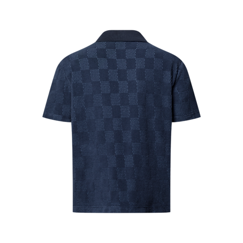 This navy cotton-blend short-sleeved shirt in comfortable French terry is ideal for vacations. The softly textured jacquard features a tonal allover Damier with a discreet embroidered Marque L.Vuitton Déposée on the chest pocket. This effortless piece is perfect for relaxing and can be worn as a set with matching shorts.