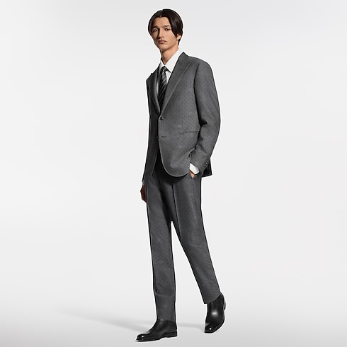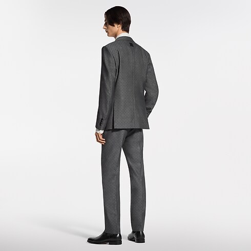 Elegantly tailored in a timeless dark gray, these flattering cigarette pants are ideal for formal business occasions. The fine wool is woven into a tone-on-tone jacquard with a sophisticated Mini Damier Seeds motif. The pattern incorporates Monogram Flowers with a softly dappled effect, while a woven LV label signs the rear waist. A matching jacket makes a poised and streamlined suit.