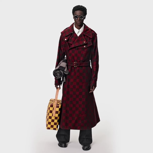 This long utility coat from the SS24 Show is made from a graphic Damier Pop denim jacquard with a bold effect. A belted waist defines the silhouette, while an LV Lovers logo is applied with studs across the back. ‘Marque L.Vuitton déposée’ signatures are discreetly incorporated into the motif for a sophisticated finish.