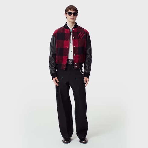 This graphic varsity blouson from the FW24 Show offers a Western take on an iconic House signature with a Damier Buffalo plaid body in a sophisticated red and black wool jacquard. A bead-embroidered ‘Marque L.Vuitton déposée’ on the chest and pearl-effect snap buttons lend a dandy twist, while grained black leather sleeves add a smart finishing touch to this standout piece.