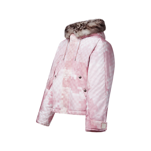 This padded blouson from the Fall-Winter 2025 show’s Pharrell and Nigo collaboration has a graphic urban vibe. It is adorned with a pink Damoflage Sakura print inspired by the cherry blossom of Nigo’s native Japan, while LV Japan embroidery signs the placket over the zipper fastening. A fluffy leopard print shearling hood completes this bold runway style.