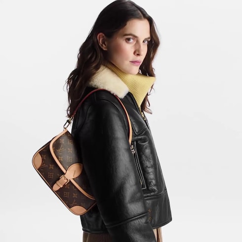 The Diane satchel in Monogram canvas revisits a classic model from the 90s, combining such vintage details as leather corners and an archival-inspired buckle with the modern functionality of smart pockets and a well-organised interior. The exclusive wide jacquard strap reverses from a bold Louis Vuitton signature to a subtle Monogram Flower motif.