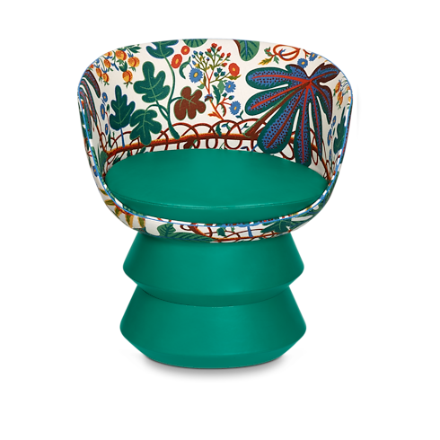 The Dolls by Raw Edges chair blends traditional folk art from across the world with the House’s extensive travel history. An eye-catching tropical print shell complements a deep green base to form a playful piece with a sculptural composition. This limited-edition item was created by award-winning Raw Edges designers Shay Alkalay and Yael Mer.