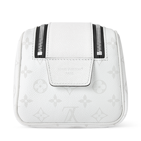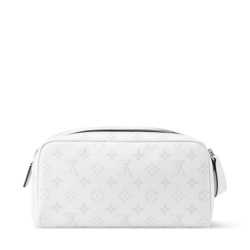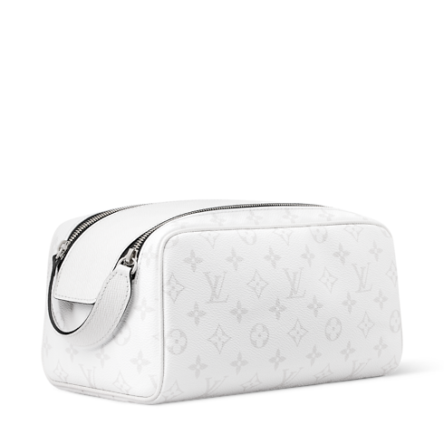The Dopp Kit toiletry bag is made from white coated canvas with a discreet Monogram pattern. Matching leather trim and silver-tone hardware complete the understated design. A double-zipper closure and wide opening offer easy access to grooming essentials, while the washable textile lining makes it eminently practical.