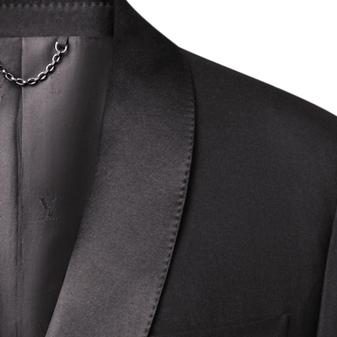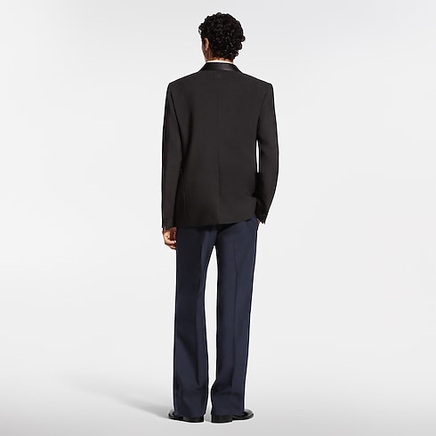 Minimalist lines accentuate the impeccable elegance of this double-breasted tuxedo jacket, tailored from black wool-silk crepe with a satin shawl lapel. A single jewel-like signature button adorns the fastening while pick stitching adds a classic sartorial detail. Finishing touches include a woven LV label on the back and LV Blason lining. Matching pants make a chic evening set.