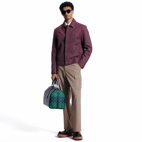This distinguished leather blouson in rich autumnal burgundy tones is adorned with an embossed allover Mini Damier motif incorporating Marque L.Vuitton Déposée signatures. Tone-on-tone inserts around the shoulders draw on this collection’s sporty collegiate inspiration, while an enameled metal LV ornament adorns the chest and jacquard Monogram elements sign the ribbed waist at the back.