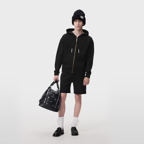 These smart black shorts in cotton jersey are ennobled with pearl ornamentation on the pocket zip pullers, while the new ‘Marque L. Vuitton déposée’ signature, unveiled at the SS24 Show, is discreetly embroidered on the left leg. This piece can be worn with a matching hoodie for a laid-back yet distinguished look.