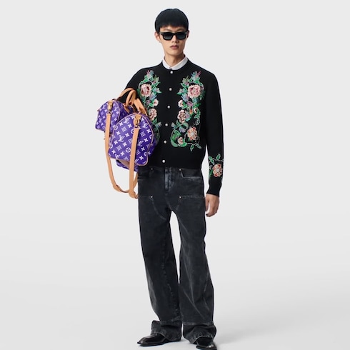 This elegant black cardigan is crafted from responsibly-sourced fine merino wool and adorned with a jacquard floral motif inspired by the FW24 Show’s vintage Western aesthetic. Crystals, pearls, sequins and beads are worked into the design by hand, adding couture-like embellishment. Pearl-effect buttons complete this sophisticated piece, which elevates both casual and timeless looks.