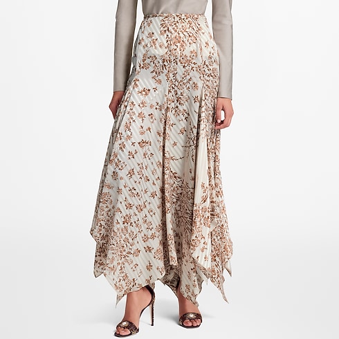 This skirt is effortlessly elegant for versatile wear in airy silk detailed with a subtle striped jacquard overlaid with muted floral motifs. It is crafted in a voluminous full-length silhouette with a breezy handkerchief hemline emphasizing the fluidity of the fabric. Fastened with an invisible zipper.