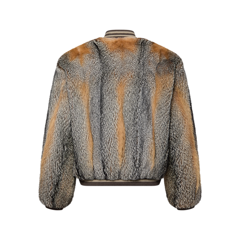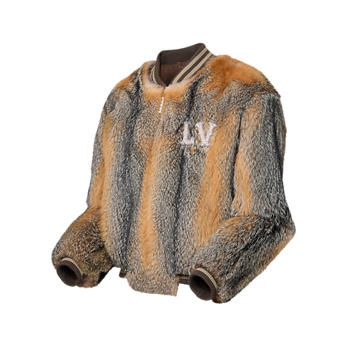 This sophisticated bomber jacket elevates a casual silhouette with deep Virginia fox fur in elegantly graduated tones. A rhinestone-encrusted silver metal LV brooch embellishes the chest, while the zip closure adds a dandy twist with a pearl-ornamented puller. Striped ribbing trims the collar, cuffs and hem, lending a sporty, modern vibe to this exclusive piece.