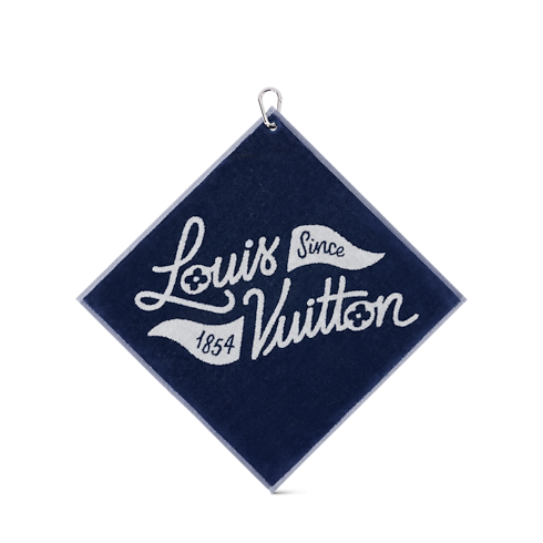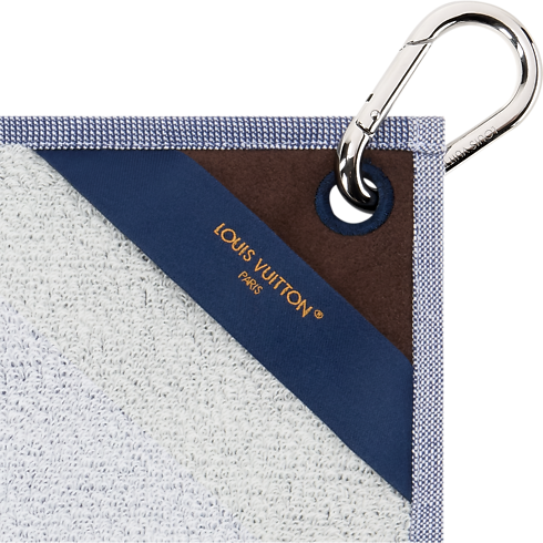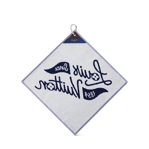 The golf towel adds a sophisticated element to the fairway. The navy blue style features the "Louis Vuitton Since 1854" signature and flag embroidery. The silvery hook affixes it to the bag or a belt loop so it stays close, within reach for cleaning clubs.