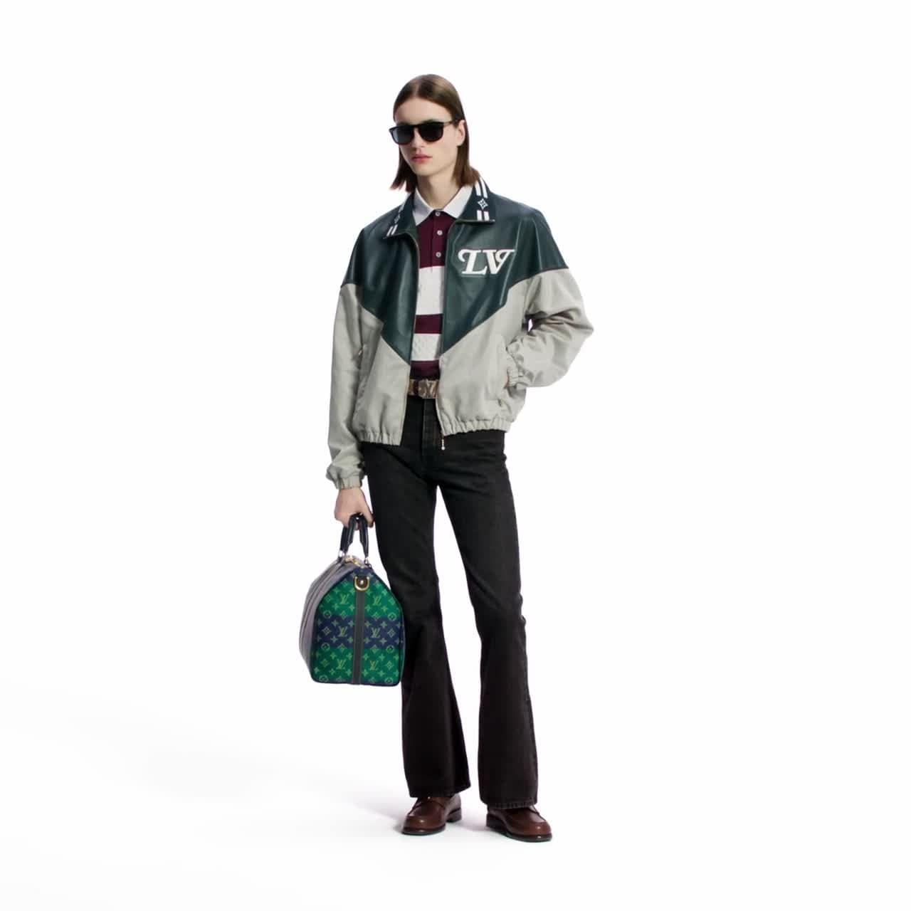 This hybrid trackstop draws on this season’s American college inspiration. The upper half comprises a pointed yoke in glossy dark green leather with a graphic contrasting intarsia LV on the chest. The bottom half is crafted in beige nylon with an elasticated waist and cuffs. Additional signatures adorn the collar, while a pearly zipper puller adds a jewel-like finishing touch.