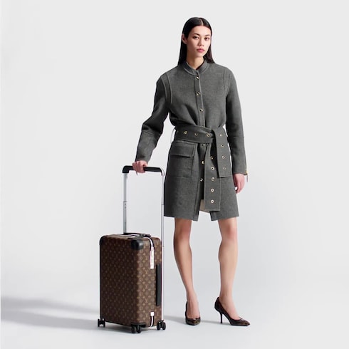 Inspired by the hazel brown and black striped Macassar ebony wood, Nicolas Ghesquière has paired Monogram canvas with matte black leather and shiny aluminium hardware to create this hard sided Horizon 55 suitcase for men. Small enough to use as carry-on luggage, this lightweight four-wheeled bag boasts a surprisingly large interior thanks to its external handle frame.