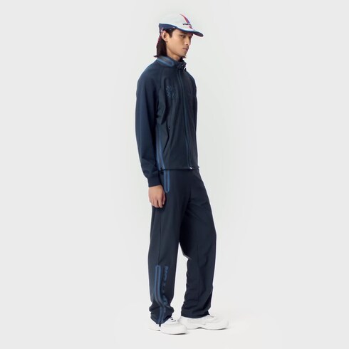 This navy hooded blouson, conceived for the Louis Vuitton 37th America’s Cup, contrasts soft cotton sleeves with knitted cuffs and a technical stretch jersey body. Adorned with LV Cup signatures front and back, it features taped waterproof zips, an adjustable hood, and vents for breathability. Matching pants make a chic set.
