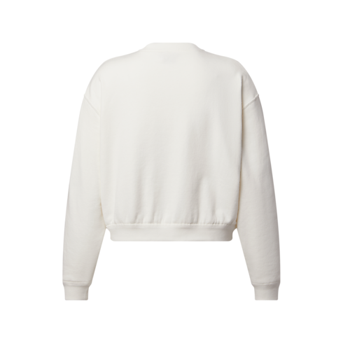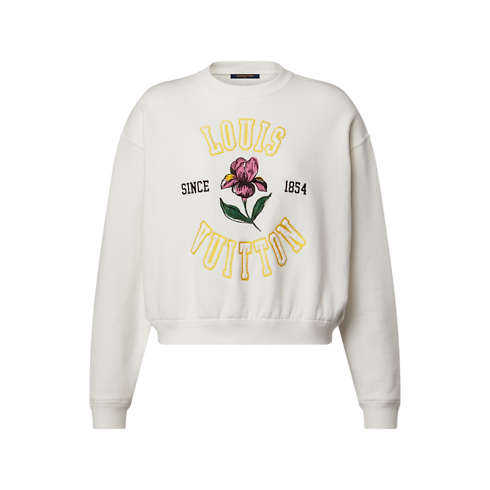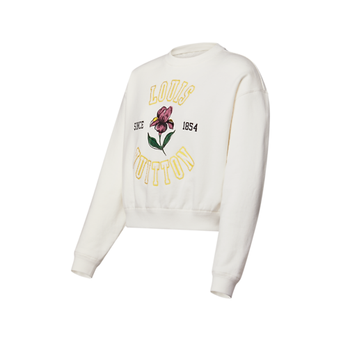 This staple sweater is reimagined with a romantic seasonal signature for an elegant spin on a sporty style. It is crafted in a casual, boxy shape from plush cotton jersey trimmed with ribbed hems for a comfortable fit. The chest is embellished with a colorful iris motif framed by large Louis Vuitton embroidery.