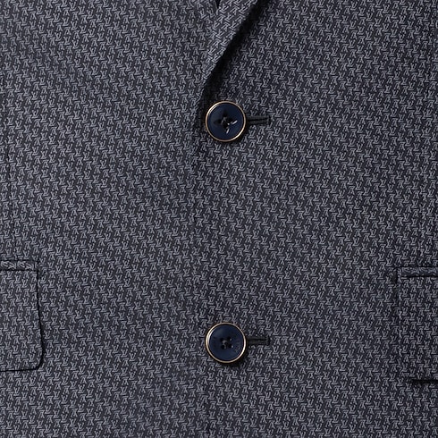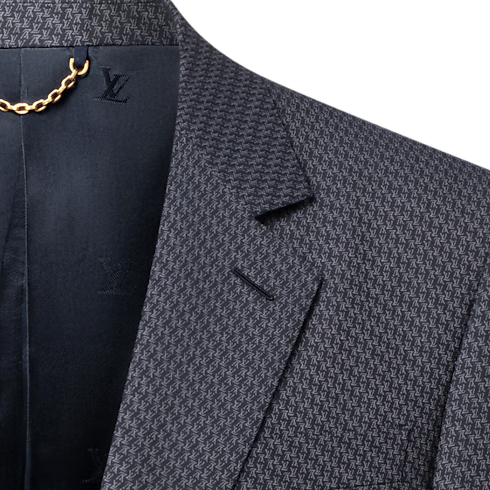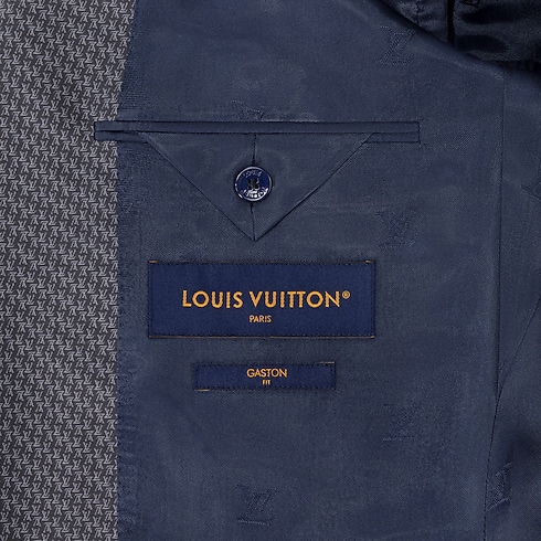 This single-breasted jacket is tailored with a straighter Gaston fit, for a business silhouette that is both chic and comfortable. The navy blue fabric is adorned with a graphic LV Interlocked jacquard motif, while the luxurious blend of wool, cotton and silk provides lightness and breathability for the warmer months. Matching pants make a chic suit.