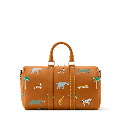 The Keepall Bandoulière 35’s unmistakable silhouette is crafted from natural calf leather with a patina finish, adorned with charging wild animals as part of the LV x The Darjeeling Limited theme. It features bold L.V. initials and a numbered detail inspired by the film. Lined in LV Blason jacquard, it includes a removable, adjustable strap.
