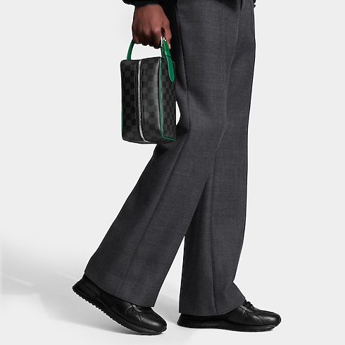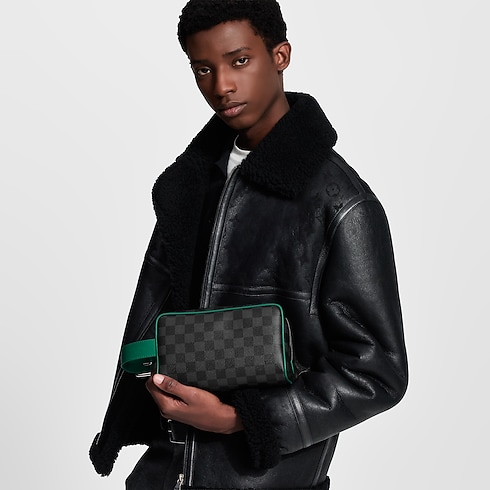 This Locker Dopp Kit toiletry bag is crafted from Damier Graphite coated canvas and features a dark-green leather handle with a silver-toned buckle. Compact but spacious enough to hold all the essentials, its practical design includes an inside zipped pocket and a washable lining as well as a comfortable adjustable side handle for added convenience.