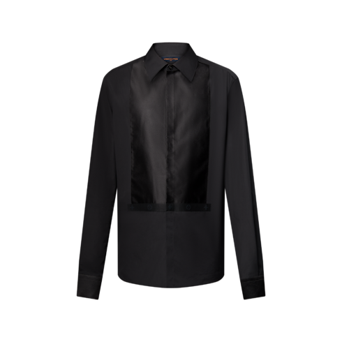 This elegant evening shirt brings a contemporary twist to a classic style. It is cut from black cotton poplin and features a satin bib front and cuffs. A jacquard band with Monogram elements accents the front, while woven labels sign the placket and the back. This piece can be styled under a tuxedo as part of a chic evening ensemble.