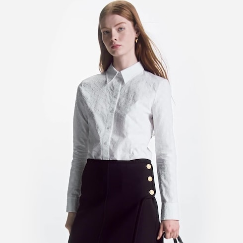 The Long Sleeved Fitted Shirt is essential in the modern woman's wardrobe thanks to its classic cut. It is crafted from smooth cotton poplin and features a refined Monogram motif in fil coupé. A Monogram Flower tab on the sleeve adds a subtle Louis Vuitton signature.