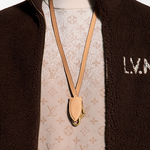 Crafted from leather in the signature House color and red "teinture de tranche", the LV Cloche key holder is the perfect companion for a daily wear: from traveling or everyday errands. The strap features a stitched key bell, reminiscent of the House's recognizable luggage detailing, and fits around the neck or loops around a bag handle. The inside is highlighting the iconic monogram.