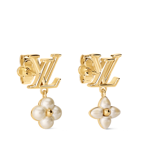 Delicately crafted in lustrous gold-toned metal, the LV Floragram XS earrings combine sophisticated feminine style with an original House signature. Their asymmetrical design features two different Monogram Flowers, heightened with pearlescent white resin and suspended from LV Initials studs. Ideal for adding a touch of graceful elegance to an everyday or more formal outfit.
