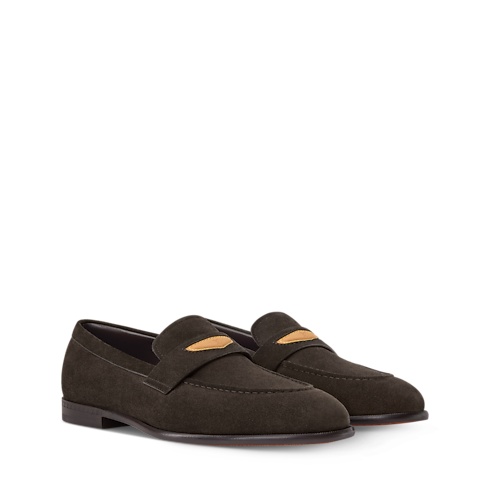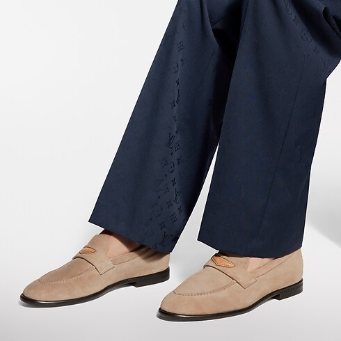 Crafted from suede calf leather, the LV Gent loafer has an exceptionally soft, supple feel, the result of both its fine material and its traditional sacchetto construction. The strap on the upper is embellished with a natural leather insert, which is embossed with the LV Initials and accented with yellow stitching, recalling the House's leather goods.