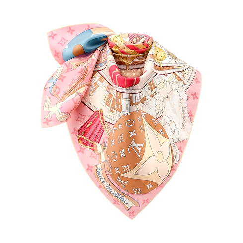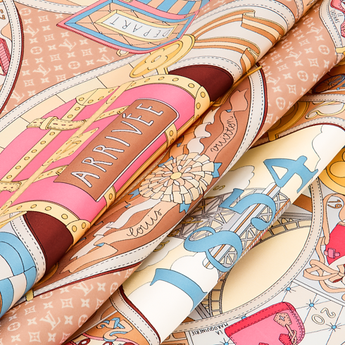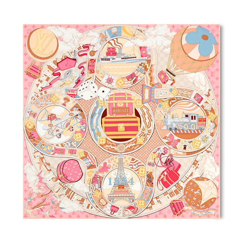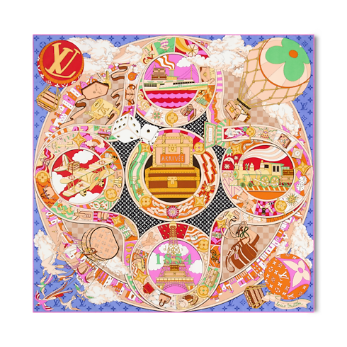 The LV Journey silk square embarks on an extraordinary adventure in the world of travel. Its intricate, playful print combines images of luggage, hot air balloons, trains, ships and airplanes with dice, clouds and the houseís signature Monogram and Damier motifs. A striking, timeless design thatís sure to make this an iconic accessory.