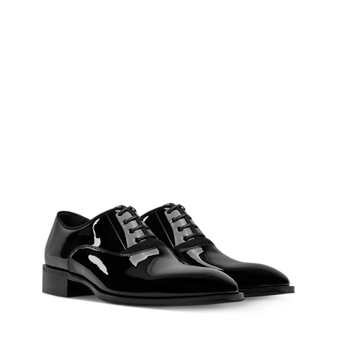 The LV Premiere Oxford lace-up in patent calf leather evokes the refined spirit of English gentlemen, revisited by Men's Creative Director Pharrell Williams. Its sleek lines are complemented by elevated details, including an embroidered signature on the laces. This model is finished with a slightly higher than usual heel and a leather outsole decorated with Pharrell Williams' signature pearl.